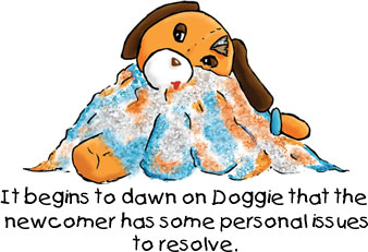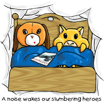 Once upon a time, Doggie and Harvey were in bed (but more in a Morecambe and Wise way than, say, a Michael Barrymore and 'man in pool' way but nothing was ever proven and it wasn't anybodies fault). Suddenly, Harvey heard a noise coming from outside! As you probably know, Hamsters are very inquisitive, and so Harvey prodded Doggie with a red-hot poker to get him to investigate.