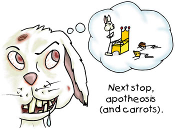 No sooner had he stepped out of the door that he was confronted by a tall bunny rabbit carrying a flick hammer and a soul full of hate. Gosh!