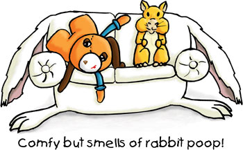 "Listen up, you scrotes! I'm Floppy, but you can call me ´Highness´," said the bunny in a Guy Richie sort of way. "I'm taking over this here manor while that big oversized welcome mat of a gorilla friend of yours is away teaching Scotsmen to speak Yorkshire in the Hebrides, right? I'm gonna make a nice little gaff and you can be my slaves forever and ever. I'm gonna give you both some quaint little handles to make you more street. I'm gonna call you on the floor 'Tonkatoy' and the hamster in there I'm gonna call 'Bogbrush'. You give me any trouble I'm gonna kill ya. You look at me the wrong way I'm gonna kill ya. You shave off my left eyebrow while I'm asleep and I'm gonna kill ya. Just so there isn't any confusion, if you ever stop believing I'm gonna kill ya then I'm gonna kill ya."
